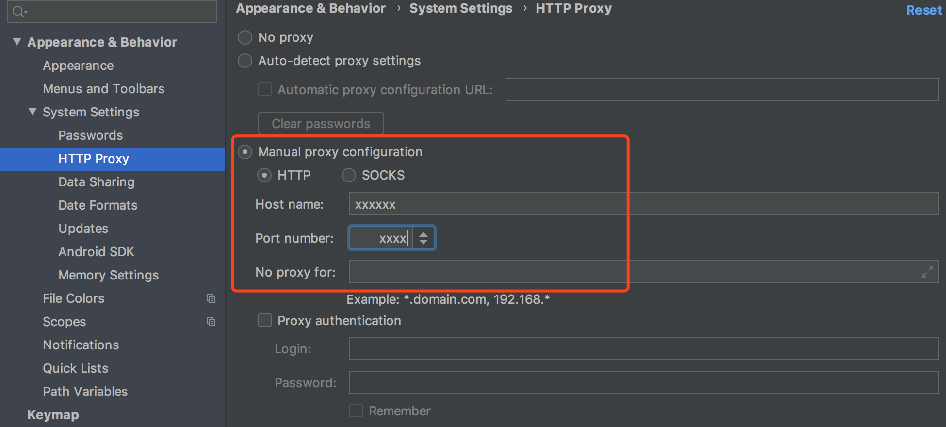 选择 Android Studio -> Perferences -> Appearance & Behavior -> System Settings -> HTTP Proxy -> Manual proxy configuration
